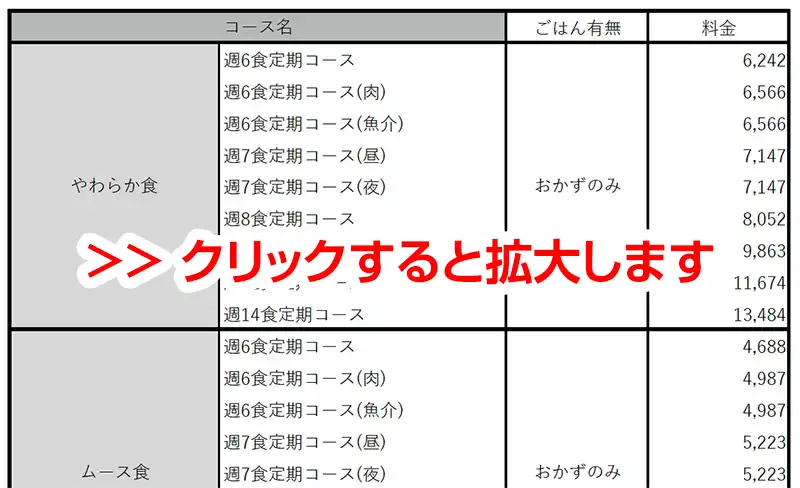 比較は一番オーソドックスな普通食の7食セットを中心に、値段を抽出しています。